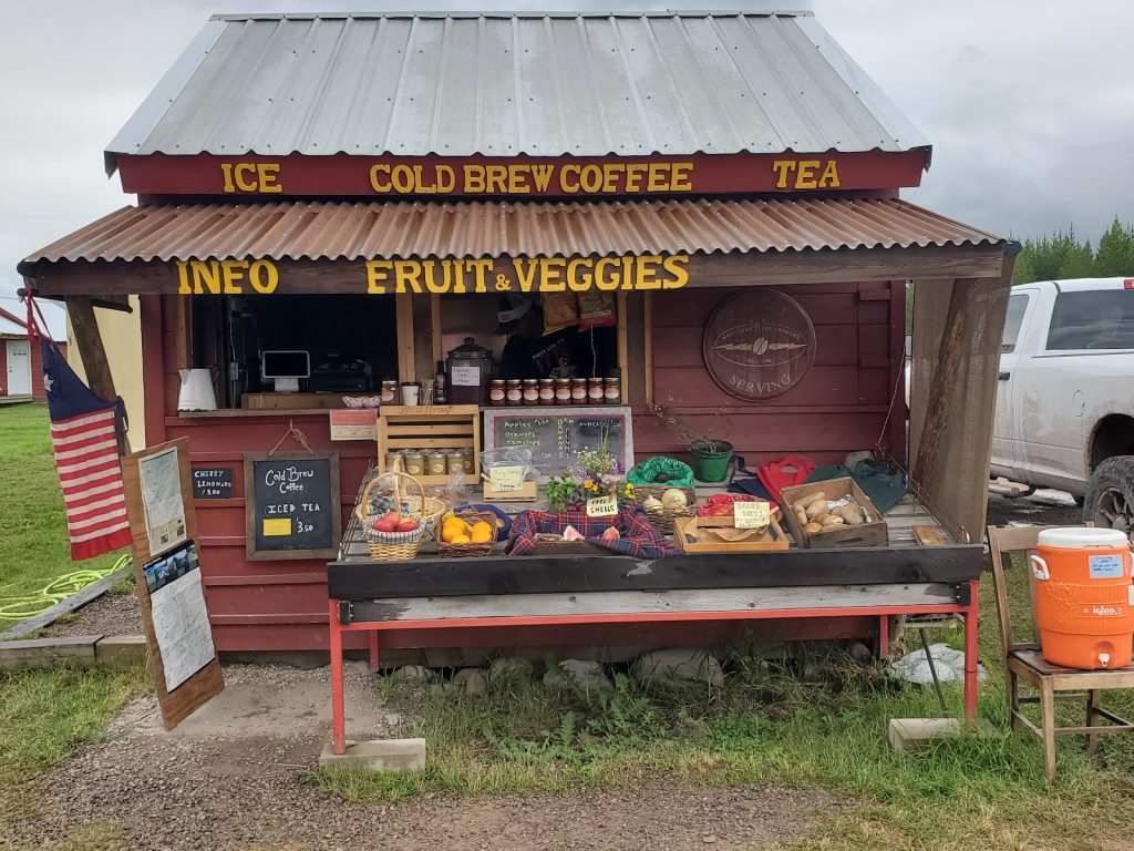 Historic Polebridge general store serving a cult-favorite Huckleberry Bear Claw with Glacier views
