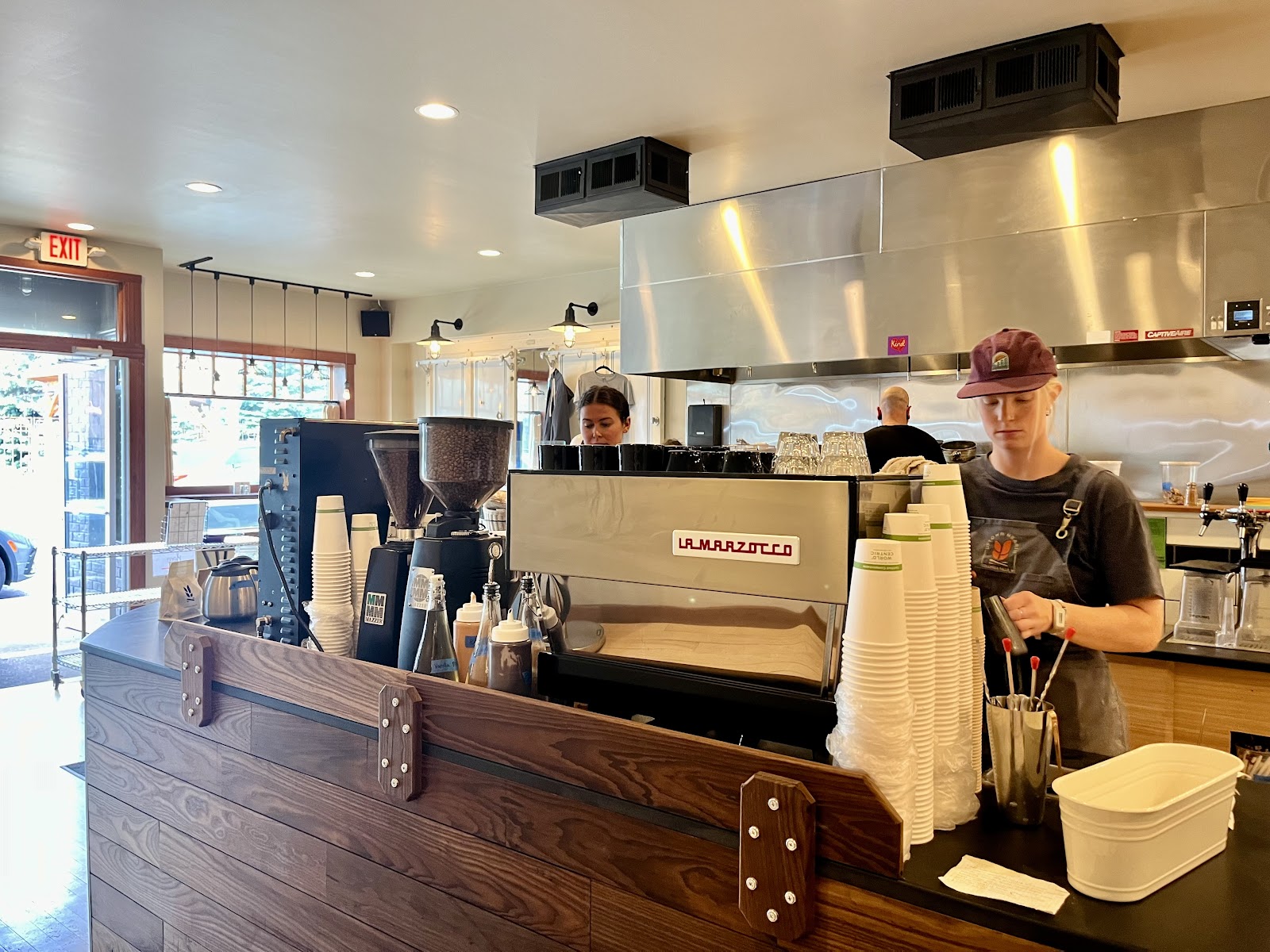 Huckleberry juice is a local beverage; the cafe also operates a full coffee program with in-house roasted beans.