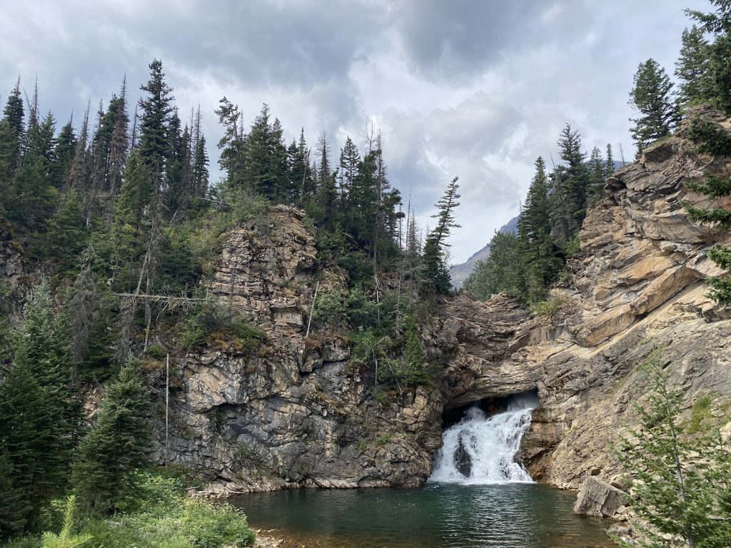 Water pours over a limestone cliff, with a second flow sometimes springing from the rock above and vanishing behind the stone. A footbridge offers a direct view of the surface cascade while the lower flow reemerges from underground channels. This is Running Eagle Fallsβa karst-like waterfall born from erosion of soluble limestone in the Altyn Formation and its hidden underground drainage.
