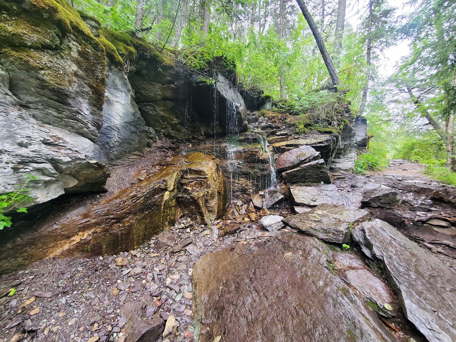 Columbia Mountain Trailhead at Glacier National Park shows a mossy rock ledge with a small waterfall and a rocky, wet trailbed.
