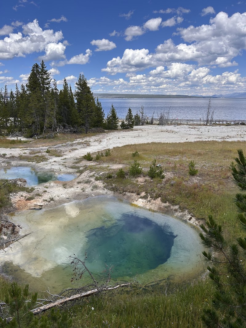 Bathroom break, quick information, and scenic lake-edge geyser viewing.