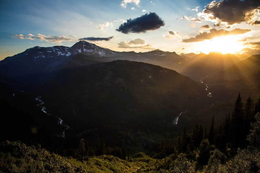 The 10-mile stretch from the West Entrance to Lake McDonald Lodge is plowed and open year-round. Apgar Village sits at the lake’s south end with unobstructed north-facing views across the water toward Stanton, Vaught, and Cannon peaks. Alpenglow hits these summits 15–20 minutes before official sunrise — position yourself on the Apgar boat dock for the reflection shot.
